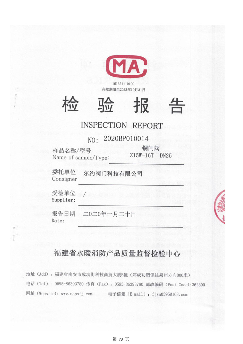 銅閘閥檢驗報告