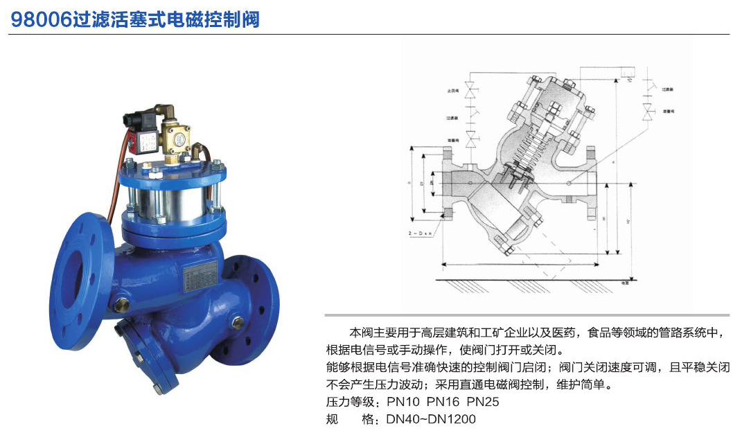本閥主要用于高層建筑和工礦企業以及醫藥,食品等領域的管路系統中,根據電信號或手動操作,使閥門打開或關閉。