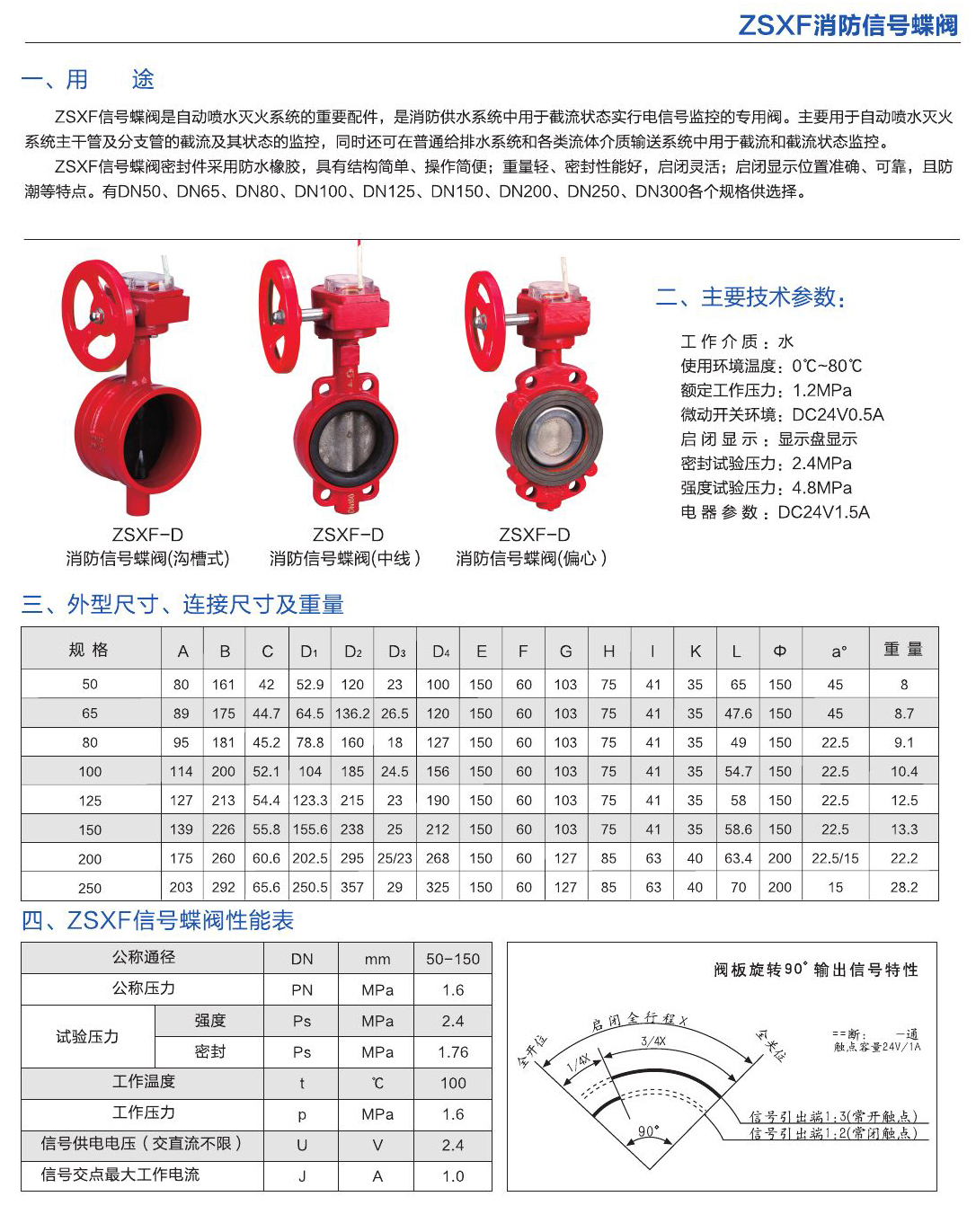 ZSXF信號蝶閥是自動噴水滅火系統(tǒng)的重要配件,是消防供水系統(tǒng)中用于截流狀態(tài)實行電信號監(jiān)控的專用閥。主要用于自動噴水滅火系統(tǒng)主干管及分支管的截流及其狀態(tài)的監(jiān)控,同時還可在普通給排水系統(tǒng)和各類流體介質(zhì)輸送系統(tǒng)中用于截流和截流狀態(tài)監(jiān)控。